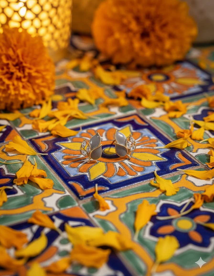 Soft petals, radiant sparkle. The Blush Petal Studs Earring from PRERA JEWELS captures the elegance of blooming florals with a modern twist. Crafted with delicate blush-toned petals and a shimmering crystal center, these studs offer a romantic glow that complements both everyday looks and festive ensembles.